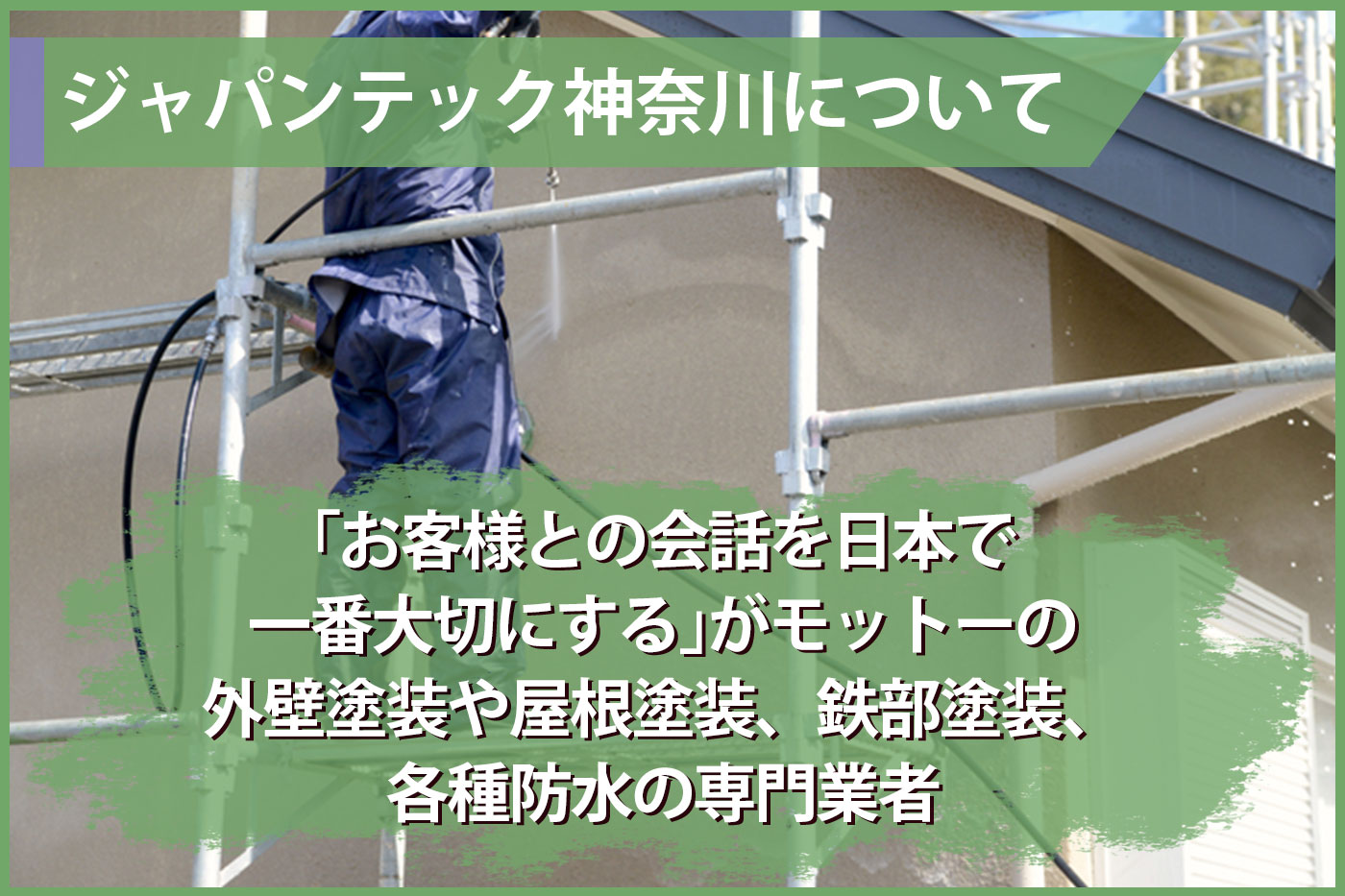 ジャパンテック神奈川は、神奈川県綾瀬市を所在地とし、外壁塗装や屋根塗装、鉄部塗装、各種防水を専門的に行っている業者です。